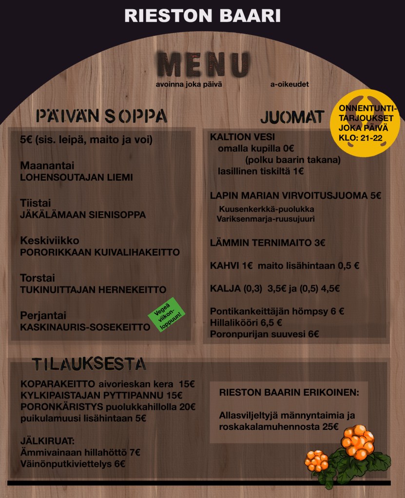 Rieston baarissa on todellista Lapin tunnelmaa! Olemme avoinna joka päivä ja meillä on A-oikeudet. Lauantaisin Riestossa tanssitaan elävän musiikin tahtiin. Joka arkipäivä tarjoamme asiakkaillemme keittolounasta listaltamme. Erityisiin tilanteisiin Rieston baari tarjoaa myös tilauksesta lappilaisen perinnemenun. Tuoretta Lapin hiilisiikaa tiskiltä. Riestossa tavataan!