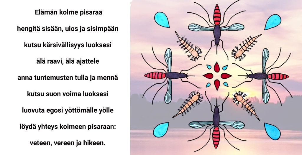 Sisäistä Kolmen Pisaran™ olemus. Alta löydät tarkemman kuvauksen. Kun olet sisäistänyt Pisaroiden olemuksen, voit opetella Kolmen Pisaran™ mantran ulkoa. Toista Kolmen Pisaran™ mantraa kun teet joogaharjoituksia, tai aina kun kaipaat elämääsi Kolmen Pisaran™ tasapainottavaa energiaa. Kolmen Pisaran™ energian kutsuminen on Jänkkä-jooga™ retriitin jälkeen maksutonta. Tarkemmat ohjeet saat retriittiin saapuessasi.